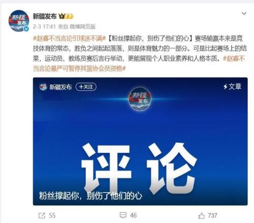 在2月3日下午新疆官方媒體“新疆發(fā)布”連續(xù)發(fā)布了兩條關(guān)于趙睿的消息,一方面是表達(dá)了自己的立場,堅(jiān)決維護(hù)祖國統(tǒng)一和民族團(tuán)結(jié),另一方面也對(duì)趙睿這次不當(dāng)?shù)难孕羞M(jìn)行了抨擊?!靶陆l(fā)布”發(fā)文說“粉絲撐起了你,別傷了他們的心。賽場輸贏本來是競技體育的常態(tài),勝負(fù)之間起起落落,則是體育魅力的一部分??墒潜绕鹳悎錾系慕Y(jié)果,運(yùn)動(dòng)員、教練員賽后言行舉動(dòng),更能展現(xiàn)個(gè)人職業(yè)素養(yǎng)和人格本質(zhì)”。