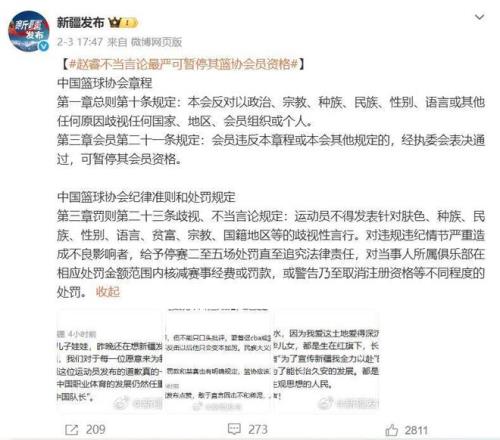另外“新疆發(fā)布”還轉(zhuǎn)載了中國籃球協(xié)會(huì)章程,以及中國籃球協(xié)會(huì)紀(jì)律準(zhǔn)則和處罰規(guī)定。其內(nèi)容明確表示任何球員不得有以下這些行為或不當(dāng)言論,會(huì)員違反本章程或本會(huì)規(guī)定的,經(jīng)執(zhí)委會(huì)表決通過,可暫停其會(huì)員資格。對(duì)于造成不良影響的球員,可以處禁賽2-5場的處罰,情節(jié)較為嚴(yán)重的可以追究其法律責(zé)任,對(duì)于球員所在的俱樂部也會(huì)有相應(yīng)的罰款或者是核減經(jīng)費(fèi),嚴(yán)重的甚至?xí)∠渥?cè)資格等。