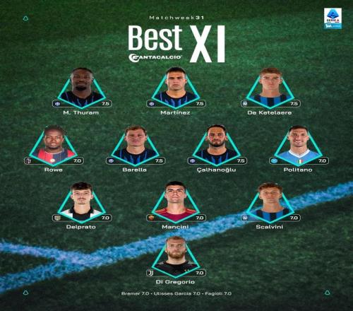 意甲第31輪最佳陣容:勞塔羅領(lǐng)銜國米4人,迪格雷戈里奧入選
