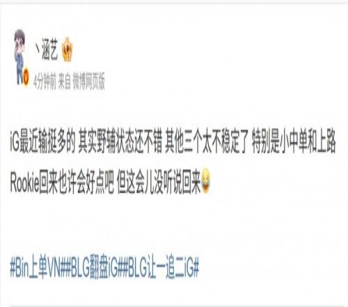 體育播報(bào)4月20日宣 EWC預(yù)選淘汰賽IG不敵BLG,經(jīng)紀(jì)人涵藝賽后發(fā)文: