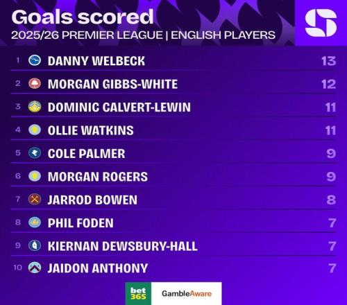 本賽季英超本土球員進(jìn)球榜:維爾貝克第1,Big6帕爾默9球最多