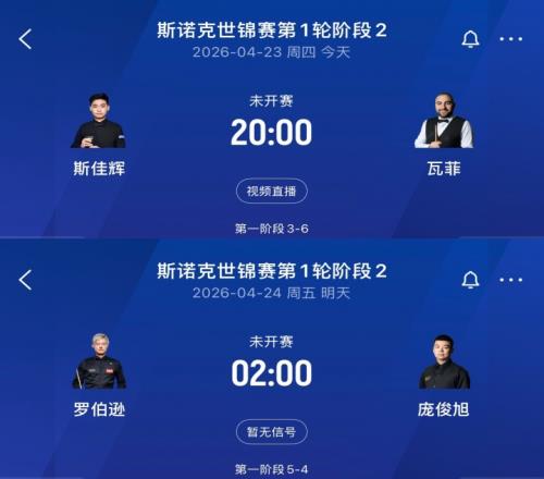 本屆斯諾克世錦賽16強已定14席,首輪還剩最后2場對決,2場都有中國選手出戰(zhàn),斯佳輝第1階段3-6落后侯賽因·瓦菲,龐俊旭第1階段4-5落后尼爾·羅伯遜。兩場比賽的第2階段分別在23日20點和24日凌晨2點開打,明晨16強將全部確定。